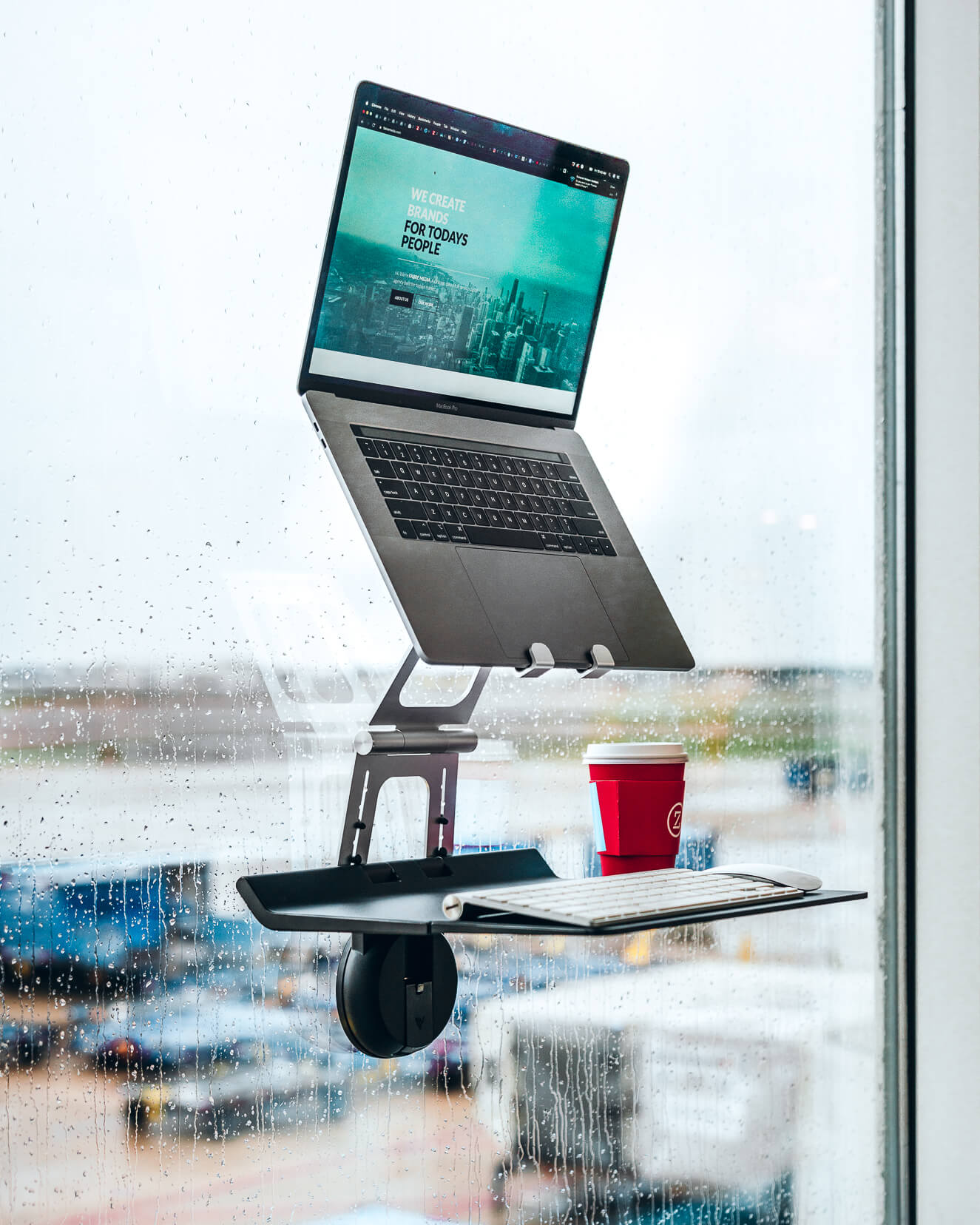 Motis attaches to any glass window, providing a compact desk surface with a view.