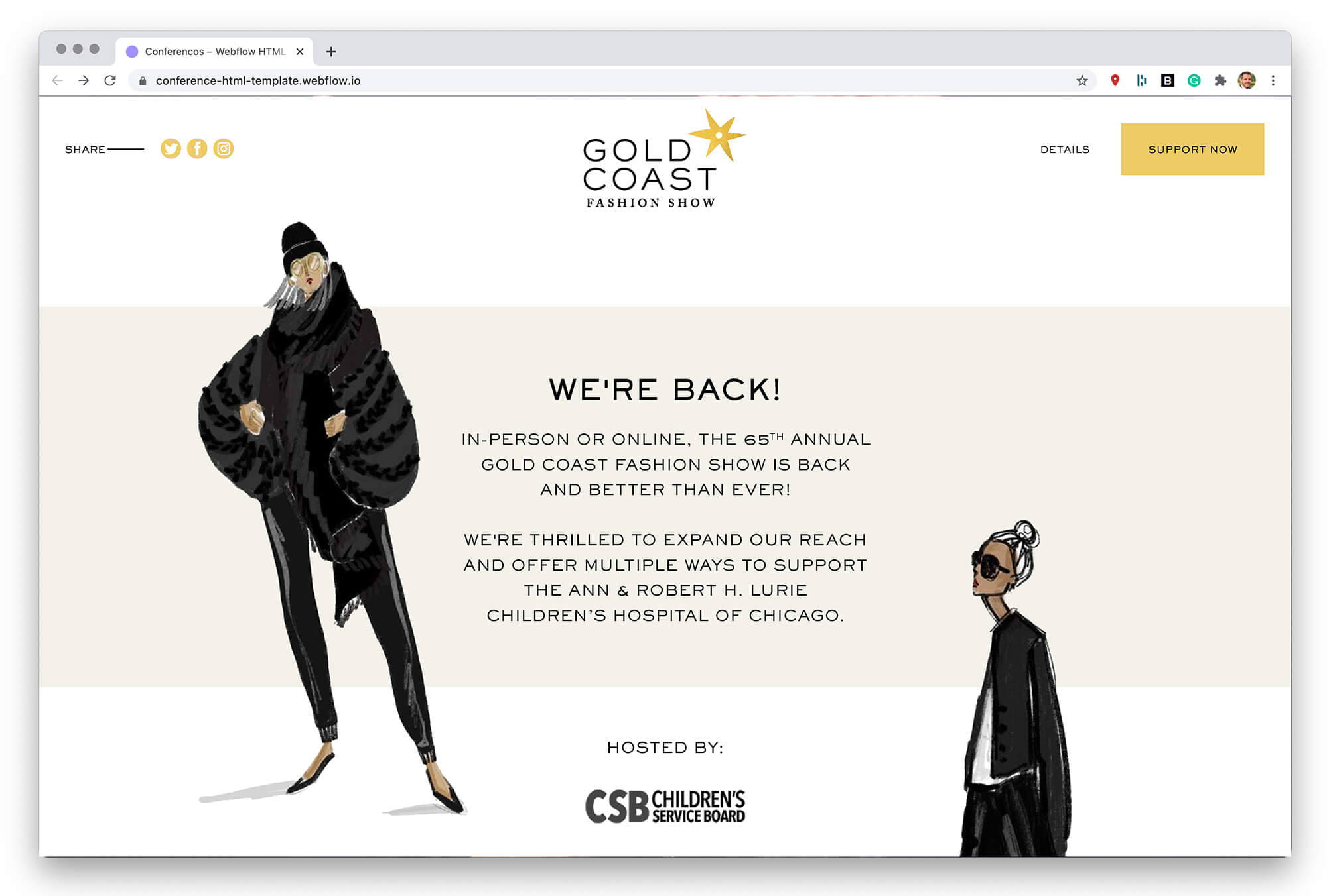 The Gold Coast Fashion Show website was created to provide event information, drive ticket sales, and capture corporate sponsors for the show. The MNML team designed and executed a new brand vision for 2021, a modern layout with gold accents and fashion illustrations by Kristine Steiner.