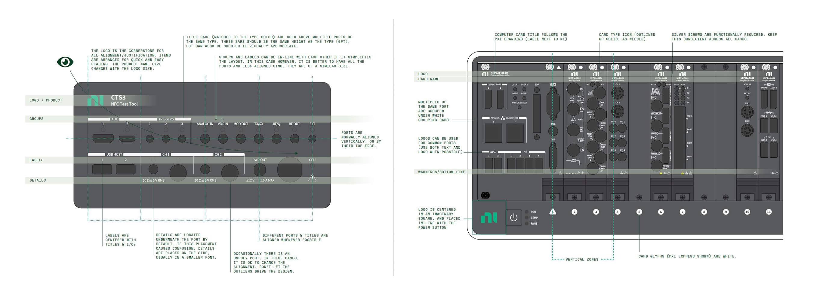 The MNML team worked with NI to demonstrate how the new design language is used across a range of products and developed a process for critical review that helps their new design team develop an intuitive sense of how to apply the design rules. Our goal was to make every engineer at NI part of the design team by providing clear standards and by reinforcing a culture of design thinking. Our comprehensive design guidelines are a complete toolkit for product design at NI.