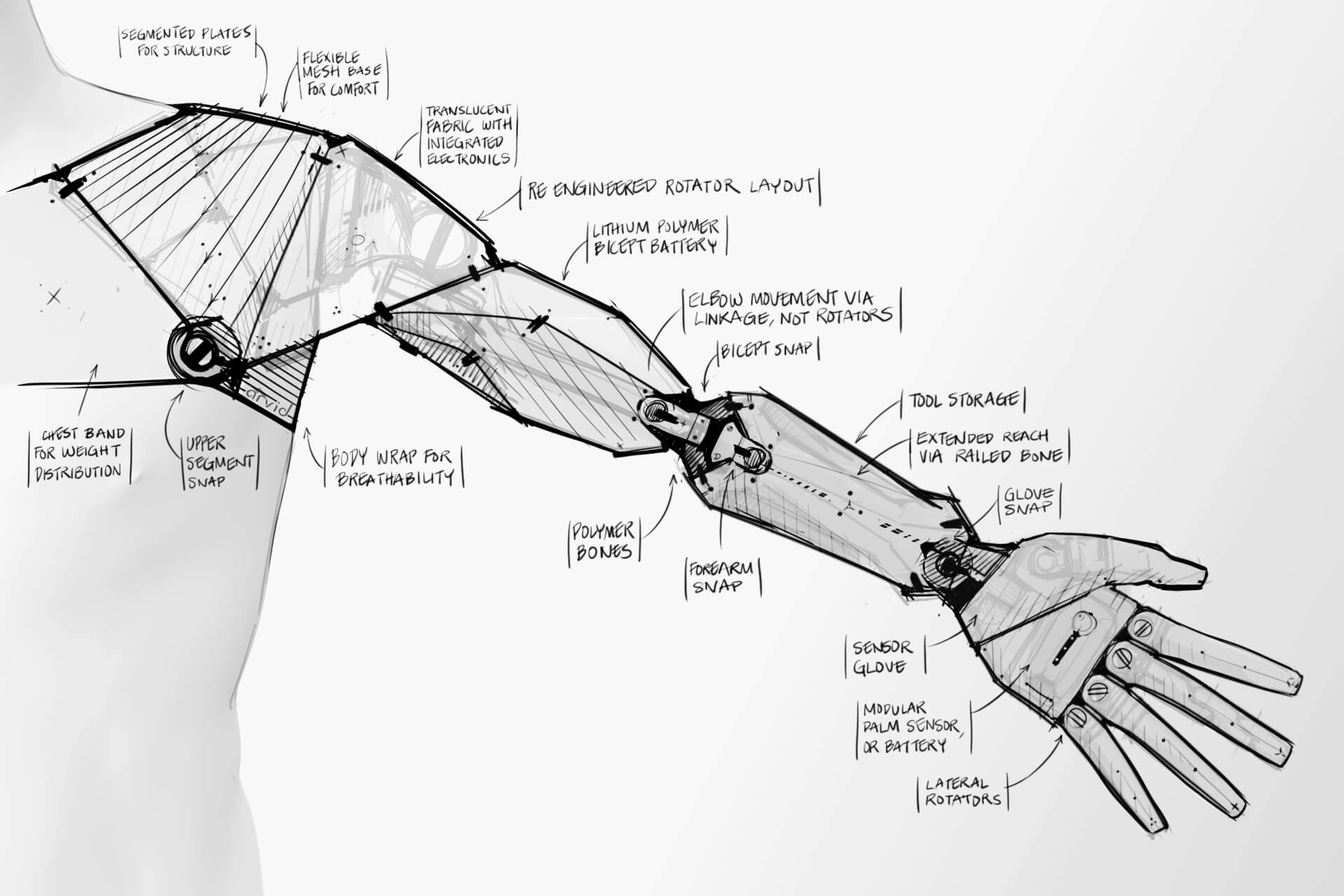 The power of Tyr 3 comes from its versatility. In addition to storage in the forearm and palm for aftermarket tools, the entire surface of the arm (the skin) is a touch sensitive screen. Always powered and always with you, this is the ultimate mobile device.