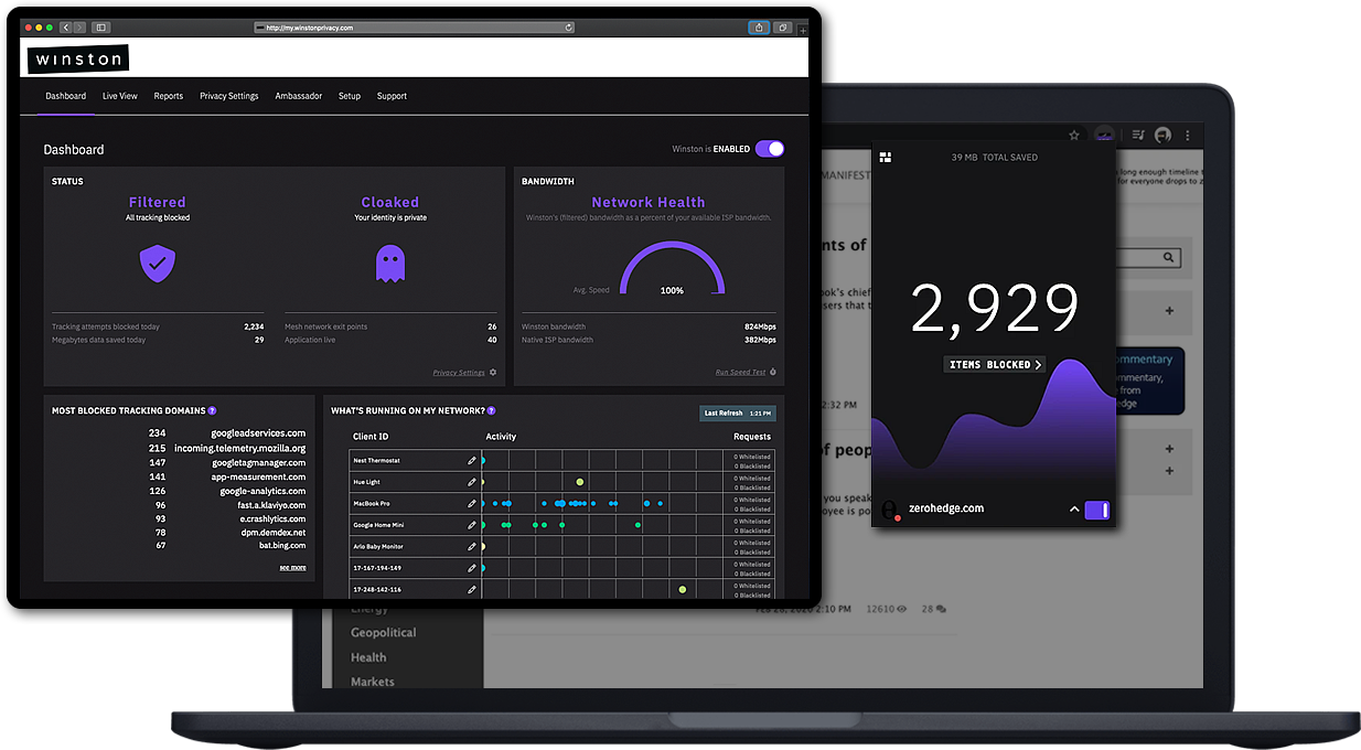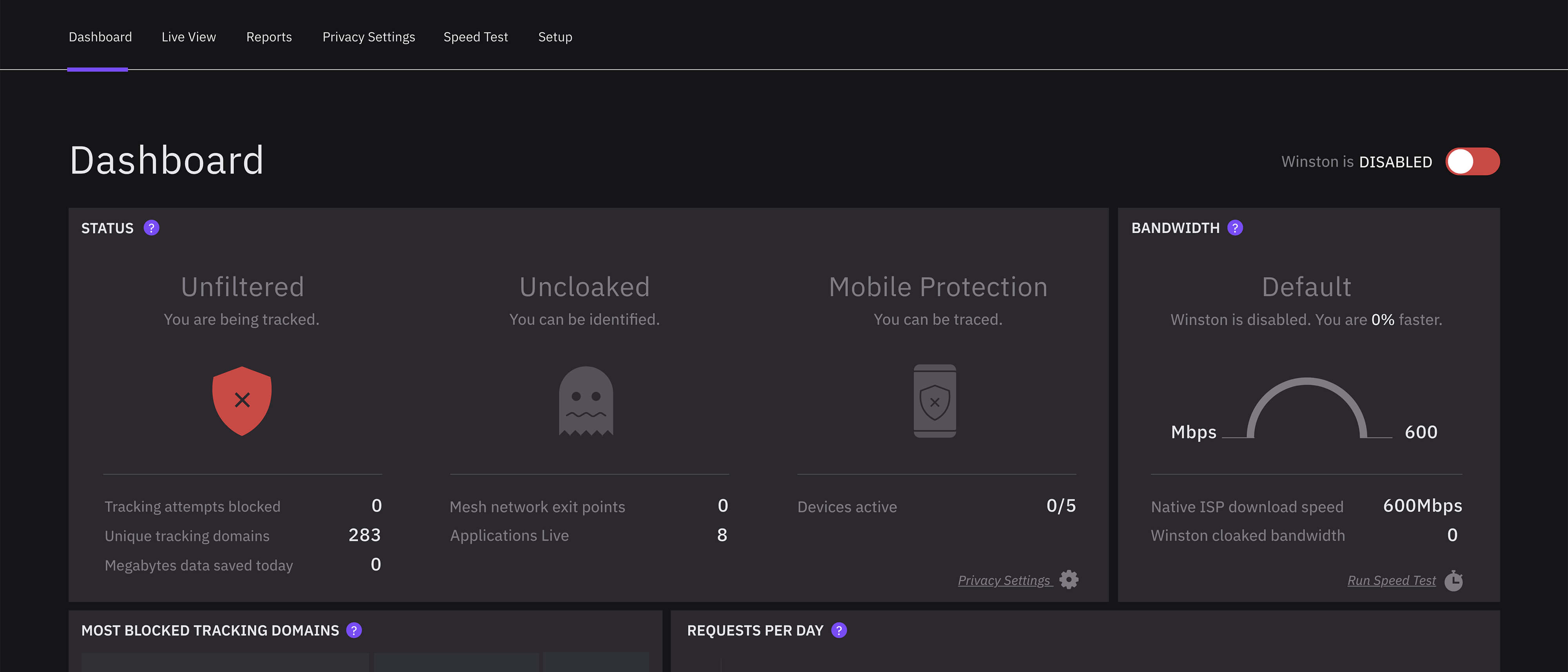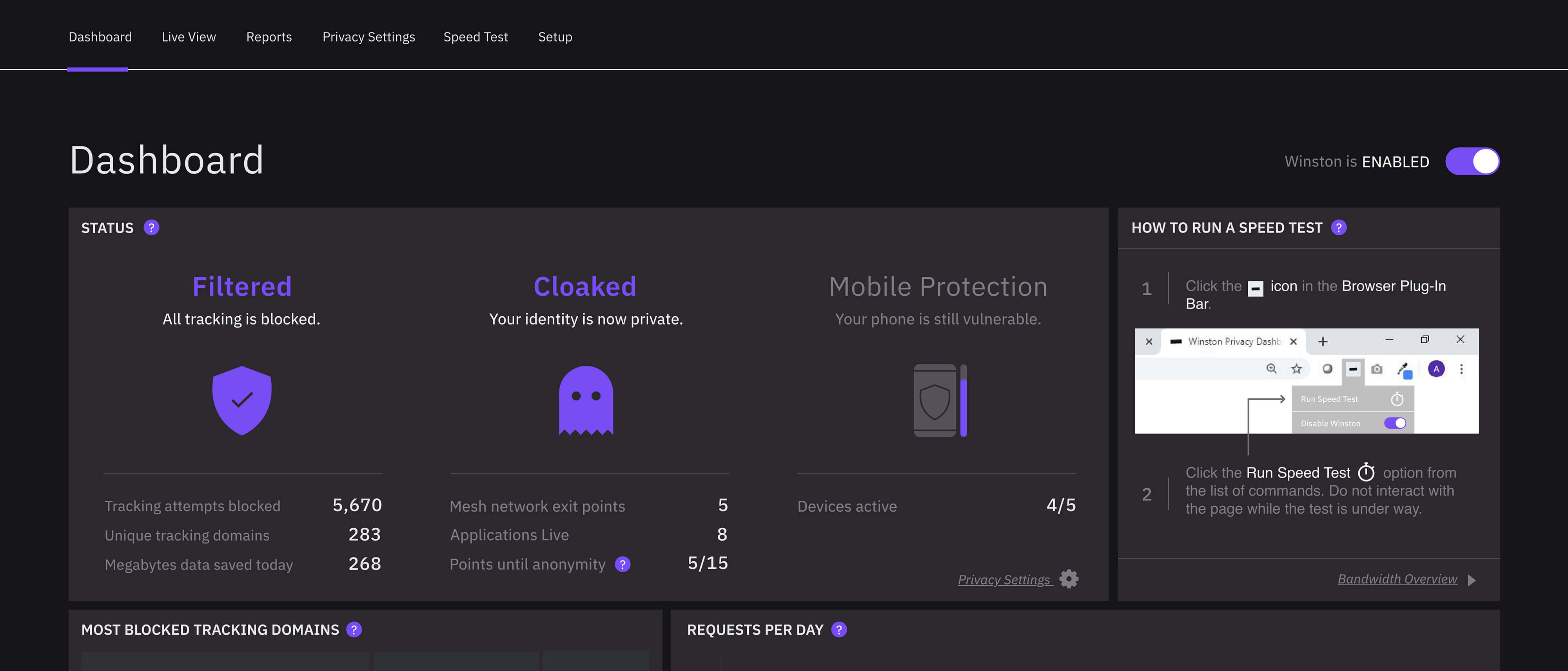 The interface below was commissioned by Winston founder Richard Stokes for their product's online dashboard. The speed graph compares different webpage load speeds, with and without the Winston filtering the results. Color is used sparingly to highlight key items, such as tracking requests (orange) and filtered speeds (purple). The graph shows all data generated within the test period, stacking each URL request and its individual load time in the Y axis and their progress in seconds across the X axis. Additional data is located upper left, while information about individual URLs pops up when it is hovered over.