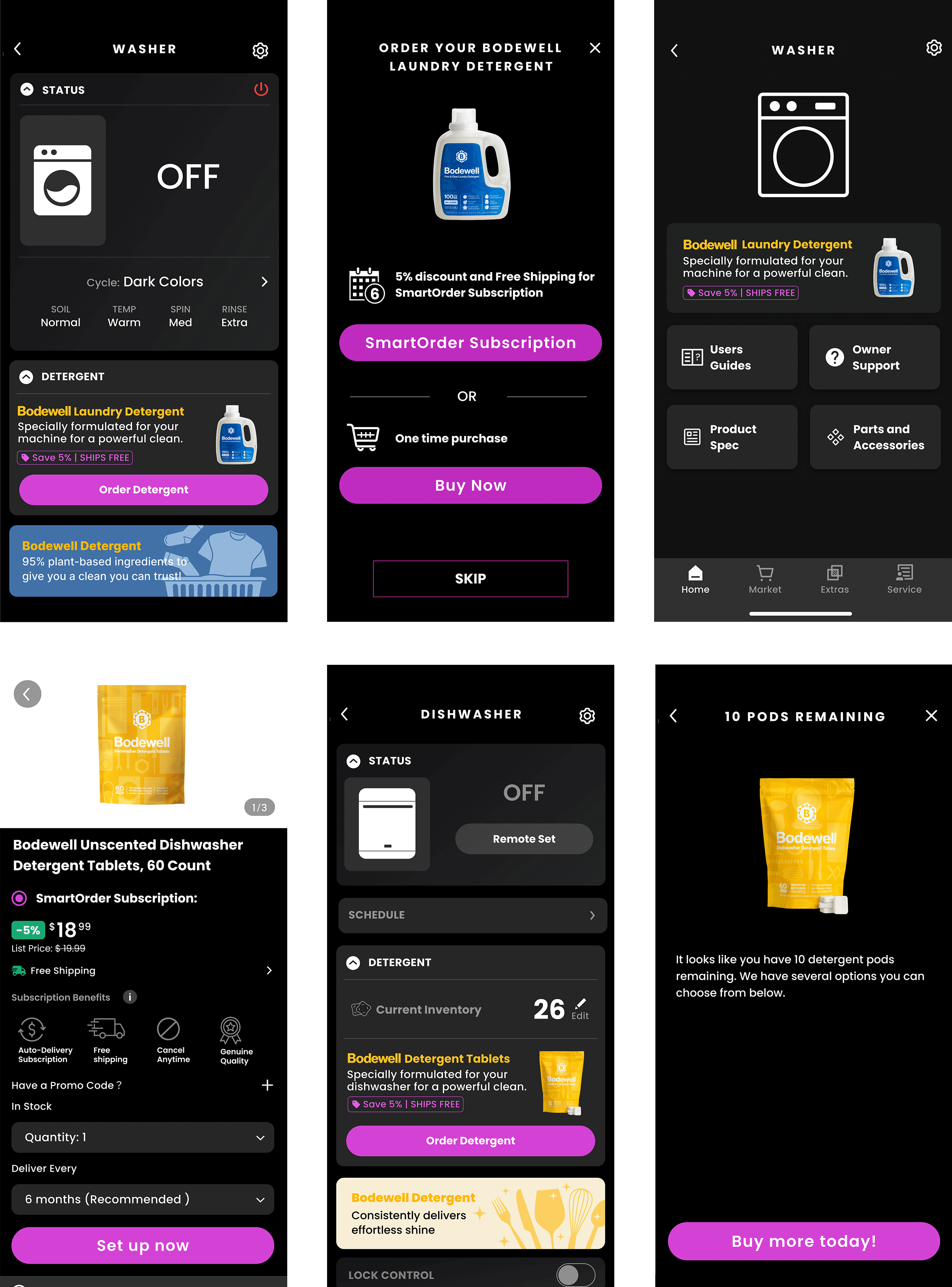 Bodewell is a sub-brand of GE Appliances that focuses on appliance delivery & repair. As part of an initiative to expand into new markets, I led the design team tasked with delivering concepts for a line of laundry and dishwasher detergents. Our goal was to move rapidly from concept to launch, enabling the business to quickly test consumer interest in subscription-based home cleaning products. In just two months we delivered two products, which released simultaneously on Bodewell.com and through GE Appliances’ SmartHQ app.